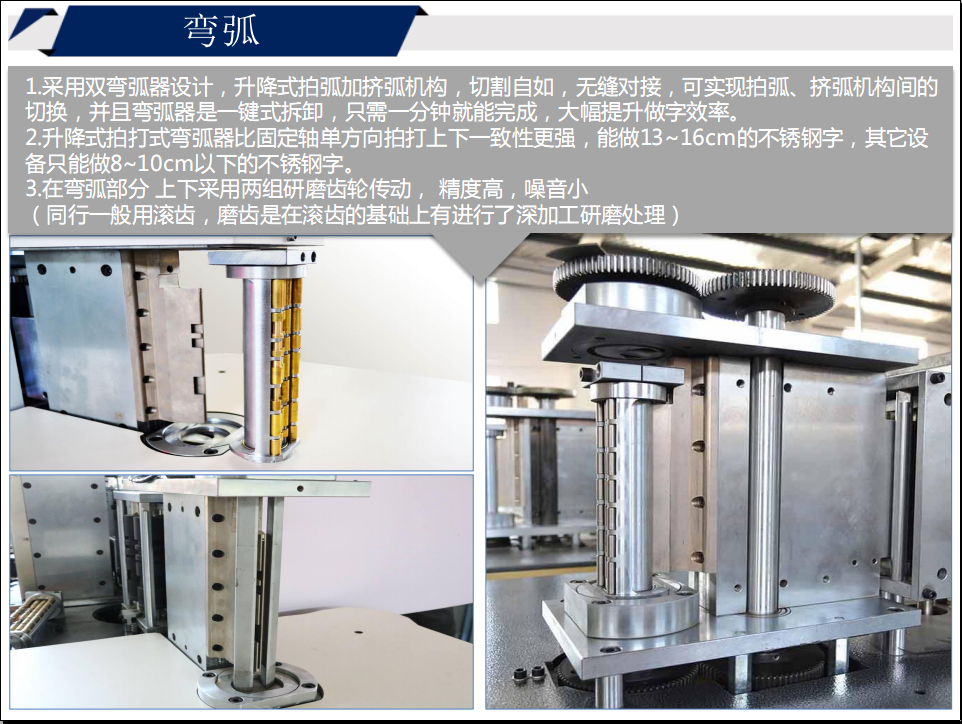 2. 升降式拍打式彎弧器比固定軸單方向拍打上下一致性更強,能做13~16cm的不銹鋼字,其它設(shè)備只能做8~10cm以下的不銹鋼字。